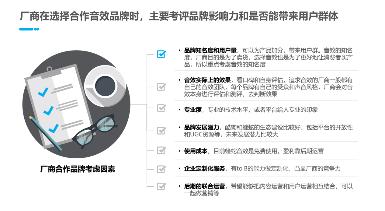 在C端的带动之下,蝰蛇音效也正成为越来越多B端厂商的选择。酷狗蝰蛇音效凭借丰富的音效选择和潮流的UI视觉优化突围而出,获得了用户们的青睐。蝰蛇可以满足他们年轻化、多元化、移动化的需求,B端厂商也希望通过和蝰蛇的深度合作,有望吸引到更多年轻客群。