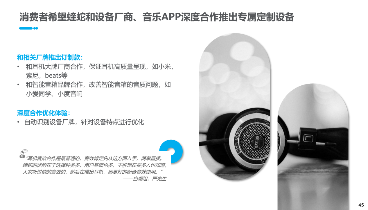 在白皮书中可以看出,消费者希望蝰蛇音效能进一步拓宽应用场景,和设备厂商、音乐APP深度合作推出专属定制装备,并且进一步拓宽合作平台,音频相关的全领域合作。顺应消费者的强烈需求,蝰蛇通过技术授权、品牌认证、定制服务等方式,与万魔(1more)等耳机厂商合作推出了多达6万款耳机音效,适配了比亚迪等142个汽车品牌,与海信、长虹等家电品牌也有深度合作,还与当贝等家庭影音品牌合作,正在走出手机,深入更多用户的客厅、车内。