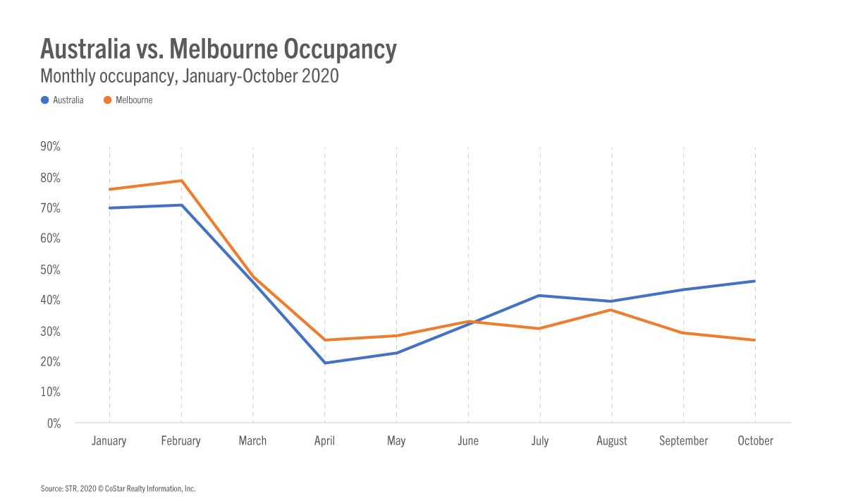 澳大利亚幅员辽阔,各州的限制措施各不相同,对酒店的影响也各不相同。澳大利亚第二波疫情的震中维多利亚州封锁了111天,直到10月底,而其他州则放松了限制,旅游和需求回升。在维多利亚州首府墨尔本,自6月份以来,旅行者入住率一直远低于全国其他地区。