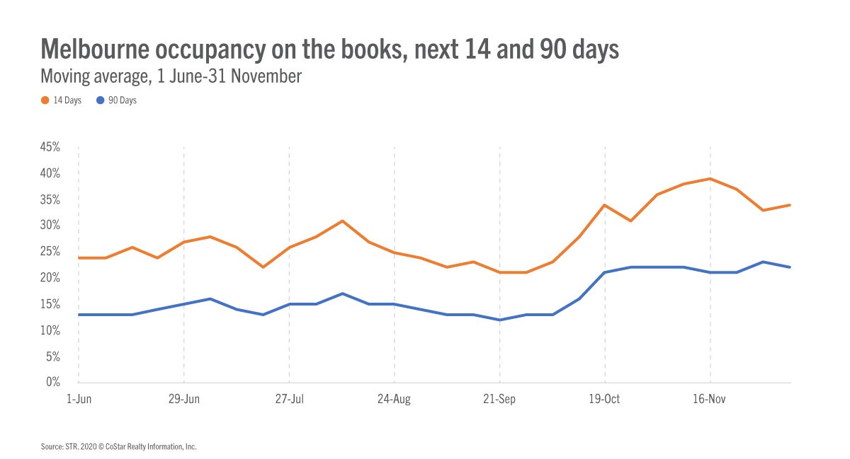 放宽限制和旅行的影响在墨尔本未来14天和90天的入住率的平均值中得到了最好的说明。从10月份开始,随着第一批限制措施的放松,入住率开始上升,并持续到每周新的平台期,90天窗口的入住率为22%,14天窗口的入住率为34%。澳大利亚网球公开赛已经从1月份推迟到2月份。由于2月份的商务旅行预订窗口要到1月中旬才开放,我们可能在一段时间内不会看到平均入住率进一步增加。这一时间表取决于内部边界保持开放,以及社区中没有新冠疫情。