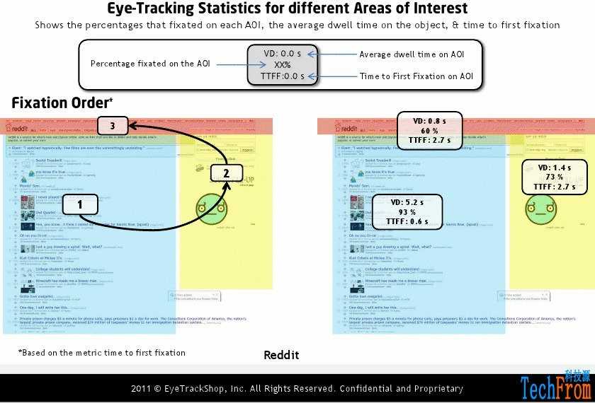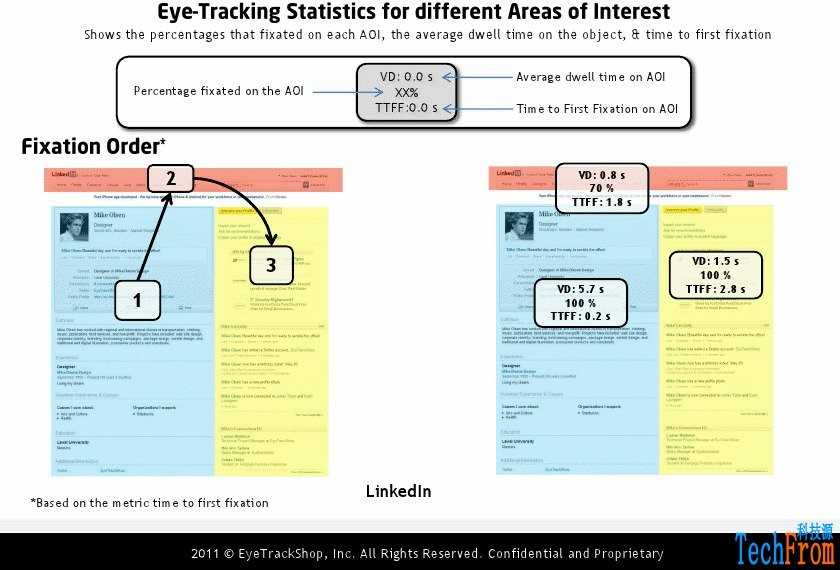 这项研究使用网络摄像头记录下了30个参与者在浏览各个社交网站个人信息页面时候的眼动情况(进入页面后10秒内的数据)。记录下的数据包括:页面上的哪些内容被重点“关照”到,以及用户浏览页面各主要区域的先后顺序。
