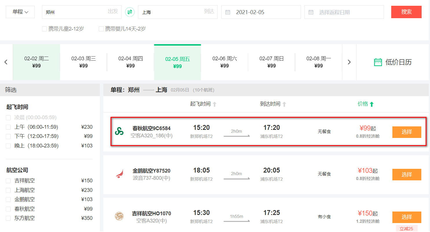 此外,一些线路的机票价格更是低到不可思议,如今年2月初的出行高峰,郑州到上海的机票价格,即使是在白天热门时间段,也还没有超过100元,仅为99元。