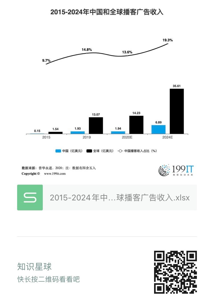 2015-2024年中国和全球播客广告收入(附原数据表) ​​​​