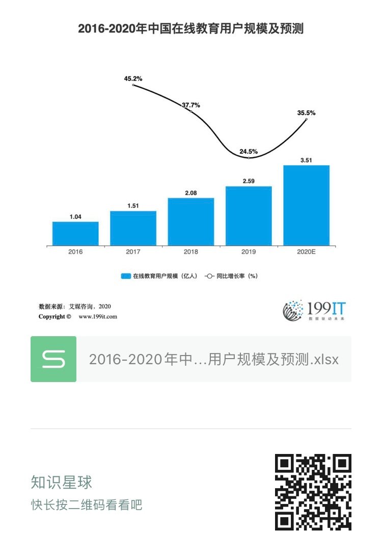 2016-2020年中国在线教育用户规模及预测(附原数据表) 更多阅读:Fastdata极数:2020年中国K12在线教育行业报告十目监测:2021年Q1在线教育行业户外广告投放研究报告热云数据:2019年第一季度在线教育App投放行为洞察报告中国科学院:中国K12在线教育市场调研及用户消费行为报告Docebo:2014-2016年全球在线教育市场趋势展望中国教育在线:2013年出国留学趋势报告在线教育,要摸准“学习”的三个内在动机2015年仅5%在线教育企业盈利 80%项目将死去2015年在线教育用户行为调查报告一位产品经理的“在线教育行业调研分析报告”一张图解读中国在线教育–信息图影响在线教育的趋势和挑战–信息图数据解读:未来的教育–信息图网易有道:1Q21总营收13亿元 同比增长147.5%七麦研究院:2021年4月在线教育热门App排行榜