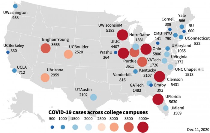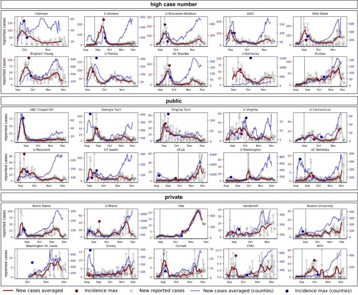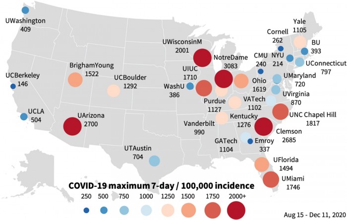 在斯坦福大学最近的一项关于这个问题的研究中,研究人员考察了去年秋季30所高校的新冠病毒爆发率。研究发现,近50%的学校在秋季学期开始后两周内COVID病例激增。