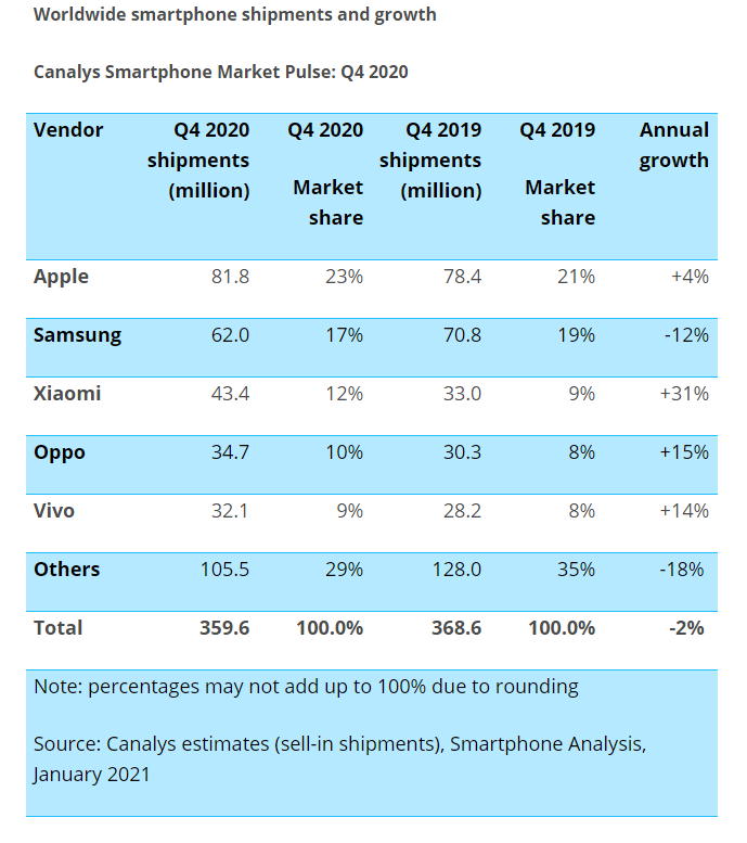 Canalys数据显示,2020年第四季度,全球智能手机出货量达到3.596亿部,同比小幅下降2%。苹果在该季度中售出了有史以来数量最多的iPhone,销量为8180万部,比去年同期增长了4%。