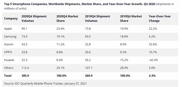 今日,两大权威市调机构IDC、Canalys先后发布最新报告。双方数据细节有所出入,但一致指向,受iPhone 12的强力推动,苹果在2020年第四季度重回全球第一宝座,小米稳居第三。