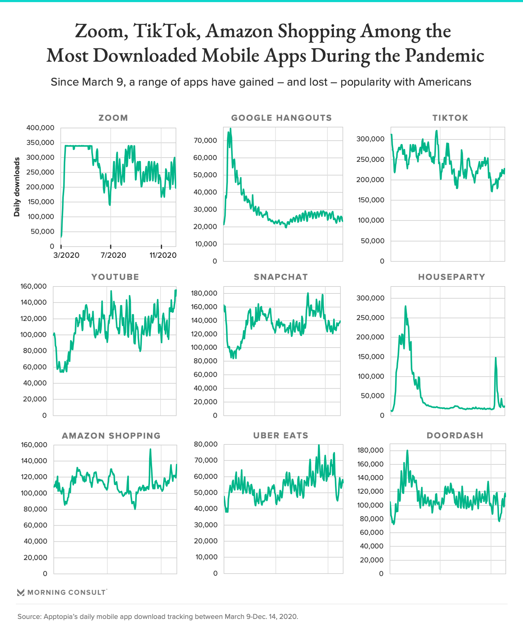但是,并不是所有的技术都证明了自己在大流行期间是必不可少的,一些社交媒体应用和外卖服务的下载量在大流行早期激增后出现了下降。例如,Houseparty的下载量在4月14日达到280216次的峰值。Houseparty是一款视频聊天服务,用户可以在不同的操作系统上与朋友聊天或玩应用内游戏。此后,除了11月份的短暂飙升和一些地区性增长之外,基本上都在下降。