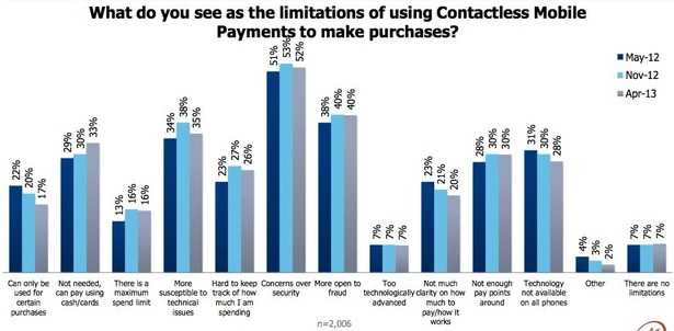 Logic的这个研究主要基于1010位英国用户的调研。这些发现同样也得到了另一个来自eDigitalResearch的证实,edigitalresearch发现安全顾虑(52%),欺诈(40%),技术问题(35%)是非接触式移动支付技术的主要问题。