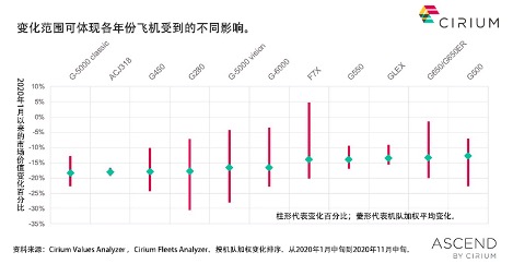 图四显示了整个商务机机队的市场价值变化分布情况(每个垂直网格代表一个型号)。在我们追踪的135个型号中,大约有一半机队的市场价值在2020年1月至10月之间发生了变化;只有一个型号的机队加权整体价值上升。在市场价值下降的型号中,一半的型号下降幅度低于10%;但有20余个型号机队加权平均下降幅度达到了10-20%。