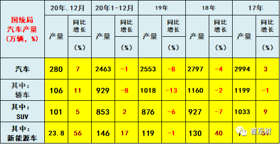 根据国家统计局数据,今年12月的汽车生产280万台增长7%是较大的增幅,其中轿车的增速11%,也是很好的高增长。。;20年12月的汽车增加值10%,处近期高位,好于去年走势。12月汽车消费品零售总额同比增长6.4%,连续4个月较强增长。。目前看今年汽车产量有望接近持平,新能源车同比高增长。