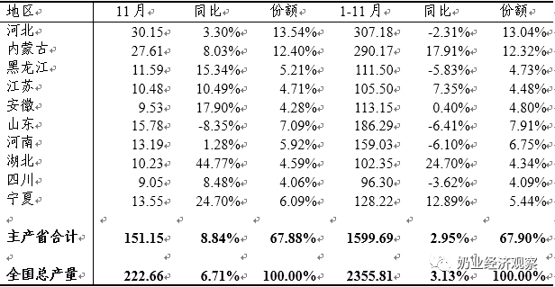 1-11月,液态奶产量前10位的省份中,同比正负增长的各5个,合计1599.69万吨,同比增长2.95%,占全国总产量的67.90%,河北产量307.18万吨,同比下降2.31%,占全国总产量的13.04%,位居全国第一位。这10省份11月份产量合计151.15万吨,同比增长8.84%,占当月总产量的67.88%,河北产量30.15万吨,同比增长3.30%,占13.54%,居全国第一位。