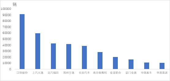 据中国汽车工业协会统计分析,2020年,客车销量排名位居前十位的生产企业依次是:江铃股份、上汽大通、北汽福田、郑州宇通、长安汽车、南京依维柯、金龙联合、厦门金旅、中通客车和华晨雷诺,分别销售9.11万辆、5.97万辆、4.27万辆、4.18万辆、3.87万辆、2.84万辆、2.03万辆、1.63万辆、1.08万辆和1.04万辆。与上年相比,排名前三强企业市场表现较为突出,销量同比均呈较快增长,其中上汽大通增速尤为显著,南京依维柯增速也超过10%,其他六家企业均呈下降,华晨雷诺降幅更明显。2020年,上述十家企业共销售36.01万辆,占客车销售总量的82.33%。