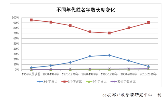 回顾历史,上世纪六十年代以前,宗族、家族姓名文化深入人心,取名字往往带上标识辈分的字,因此三字姓名占比超过90%。