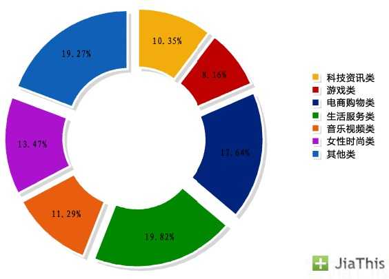在1月份的时候,JiaThis针对中国移动“爱分享”、中国联通“WO+分享”、中国电信“手机快传”用户分享占比进行了分析,随着移动端媒体接口:微信、移动微博等的不断增加,JiaThis针对移动端分享内容进行了分析,结果显示:移动端分享主要以生活、电商购物为主,约占比例为37.46%。