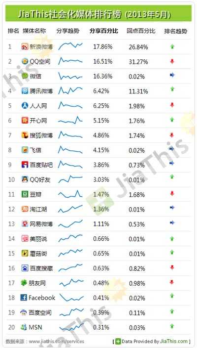 国内的社会化分享工具提供商JiaThis最新发布的《2013年5月国内社会化媒体分享数据排行报告》具体数据如图: