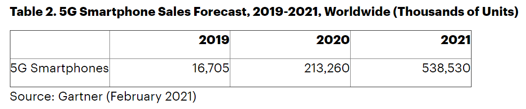 随着5G网络的日益成熟,加上以200美元起价的5G智能手机种类增多,将引导成熟市场和中国的需求。新兴国家的需求将受到寻求更高规格智能手机和5G连接作为可选功能的需求推动。Gartner预测,2021年全球5G智能手机销量将达到5.39亿部,占当年智能手机总销量的35%。