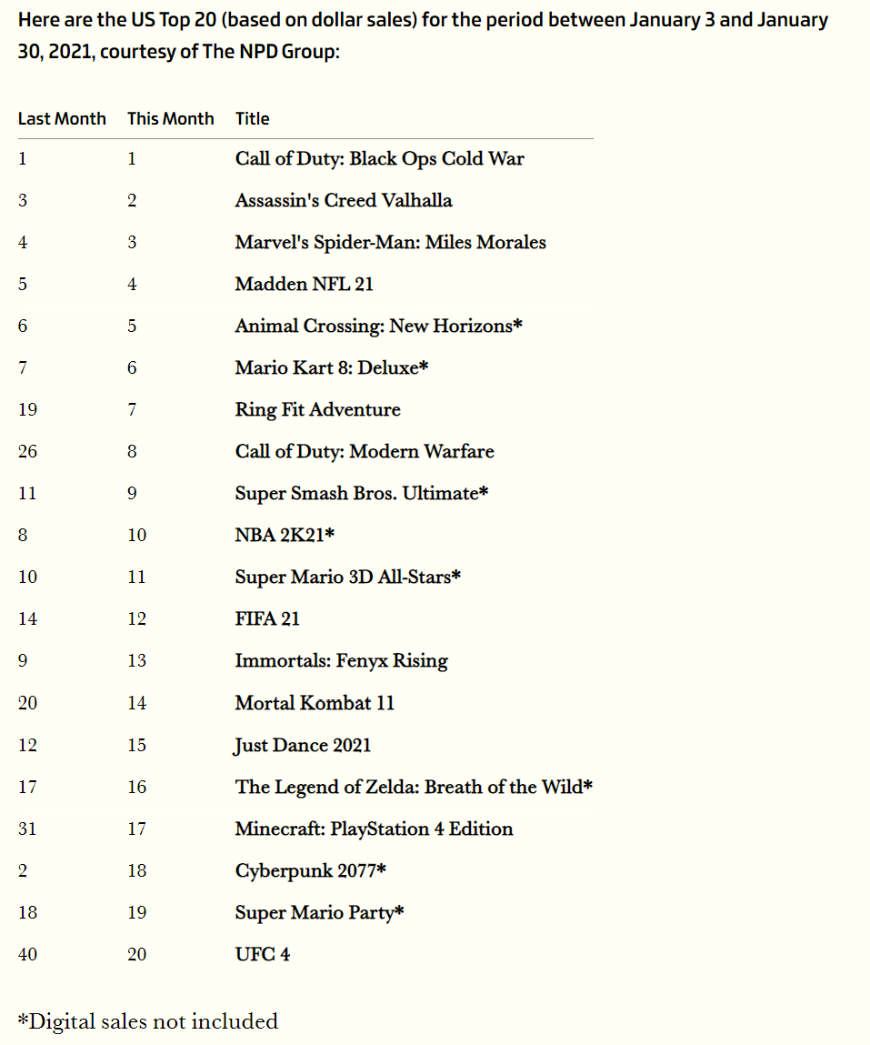 12月份最畅销的游戏中有一半在1月份提高了排名,只有《赛博朋克2077》从整体排名第二下降到第18位,其他游戏没有一个下降超过四个位置。