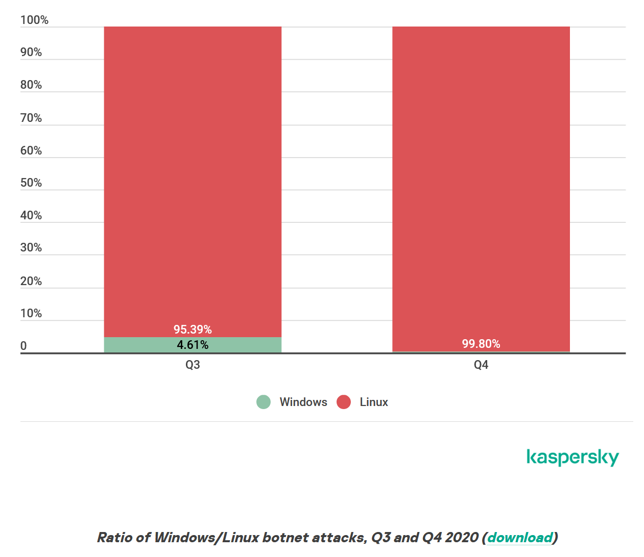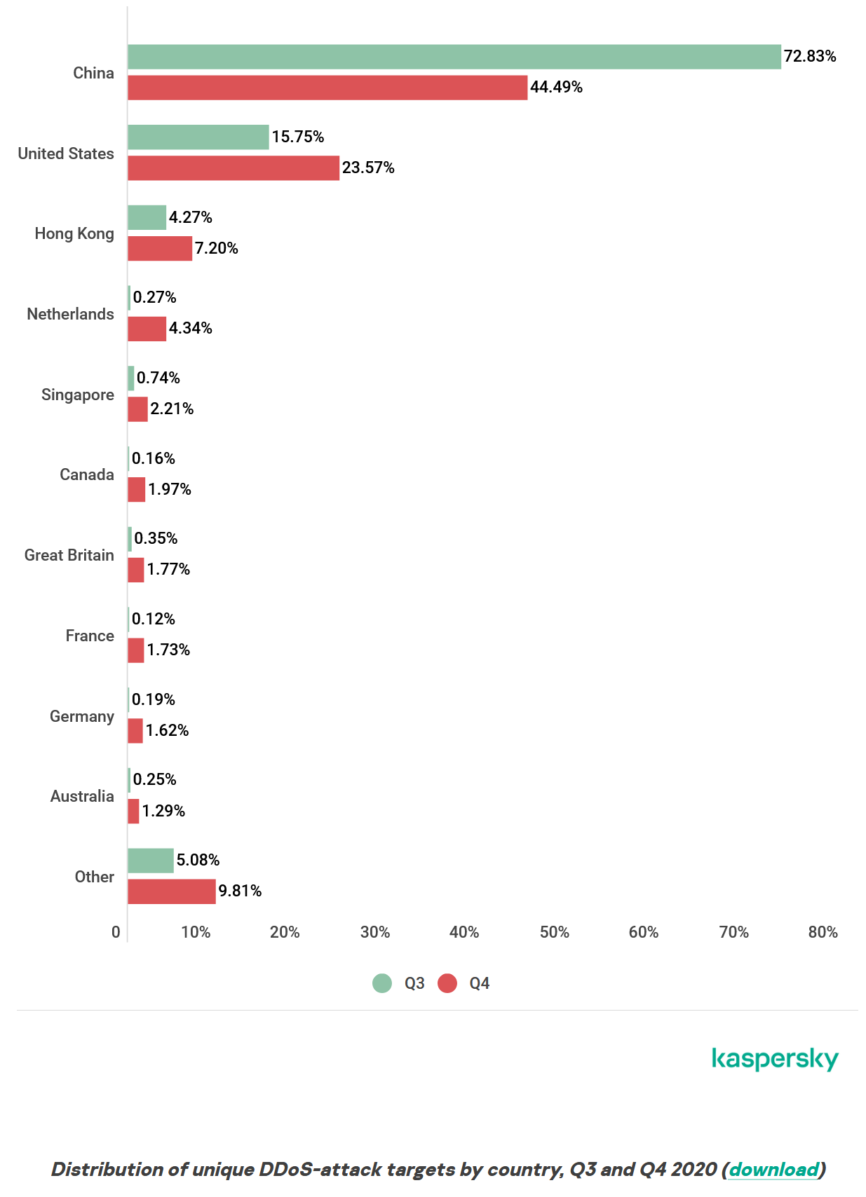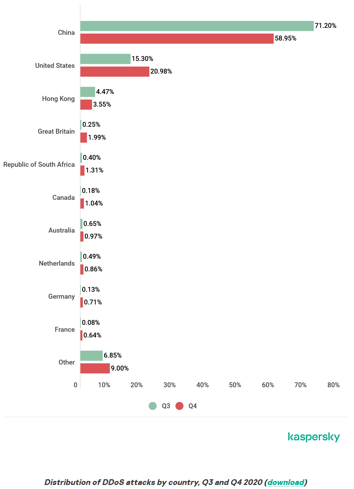 根据卡巴斯基实验室的最新数据,2020年第四季度 DDoS攻击的国家和地区与此前一致,中国(58.95%)、美国(20.98%)和中国香港(3.55%)在DDoS攻击数量上领先。