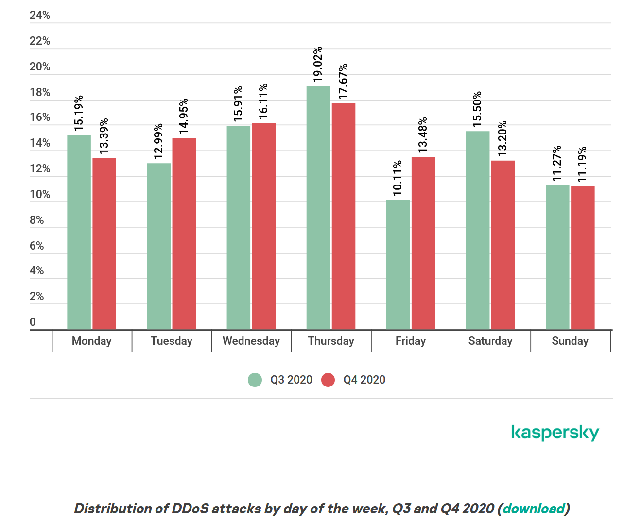 周四是第四季度DDoS攻击数量最多一天,而周日则最少。