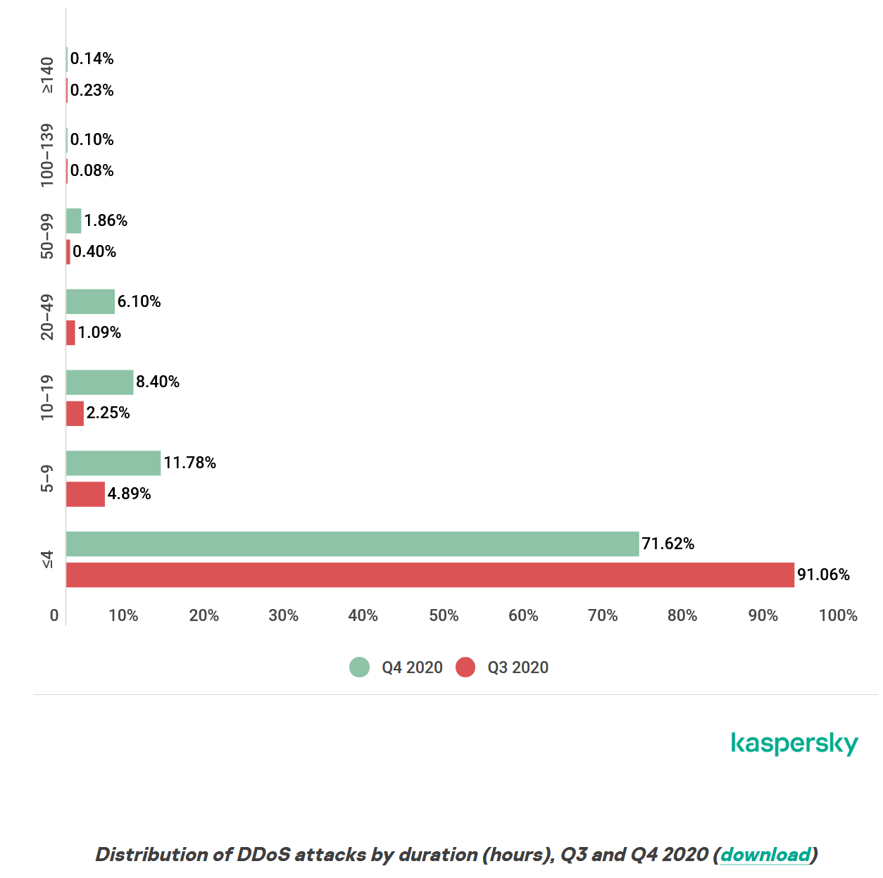 第四季度,非常短时间的攻击(71.63%)和非常长时间的攻击(0.14%)的份额分别下降,而所有中间时段攻击的份额则有所增加。