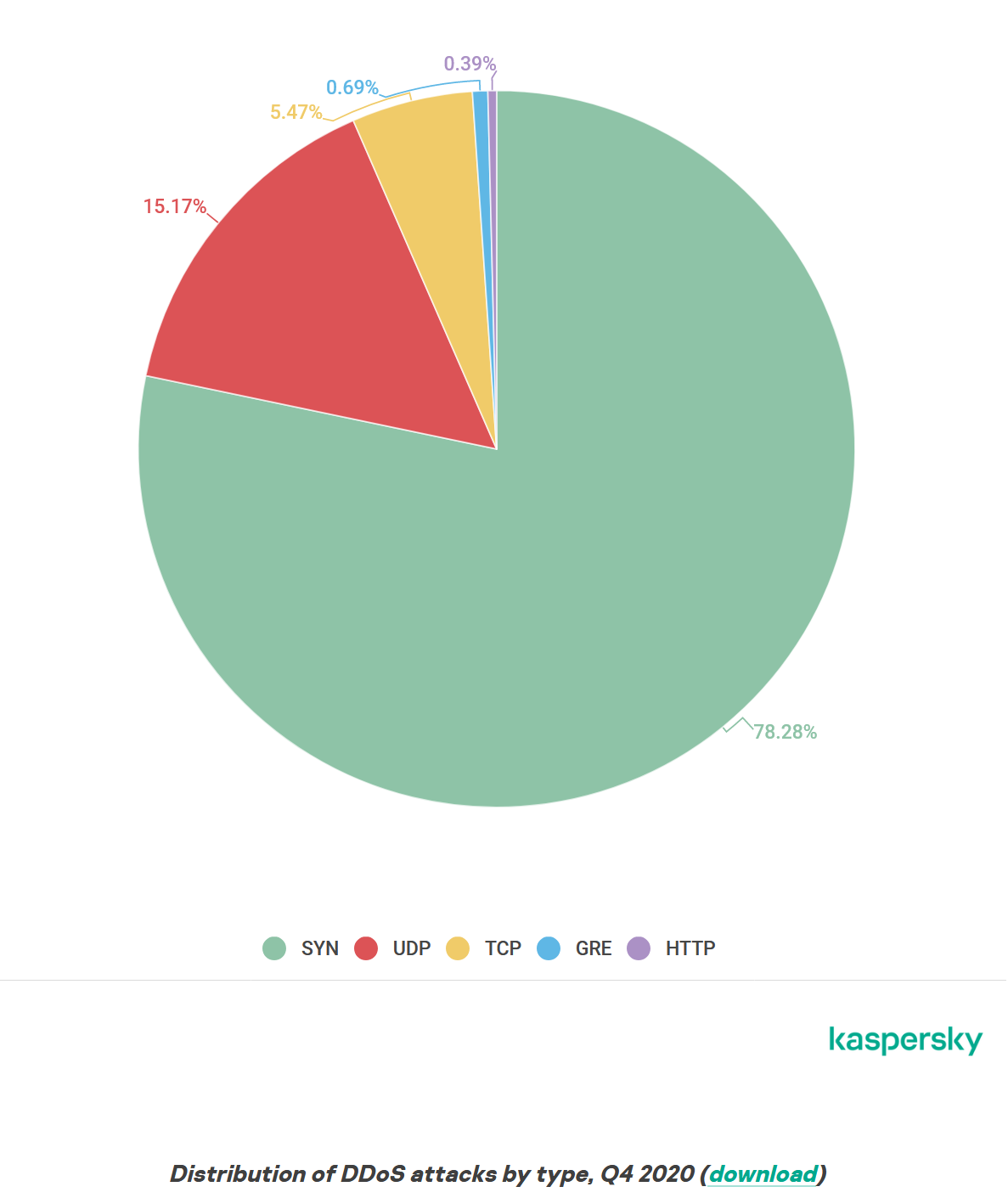 第四季度按类型划分DDoS攻击的分布表明,UDP泛洪位居第二(15.17%),而卡巴斯基报告中未提及的GRE泛洪成为第四大常见事件(0.69%)。
