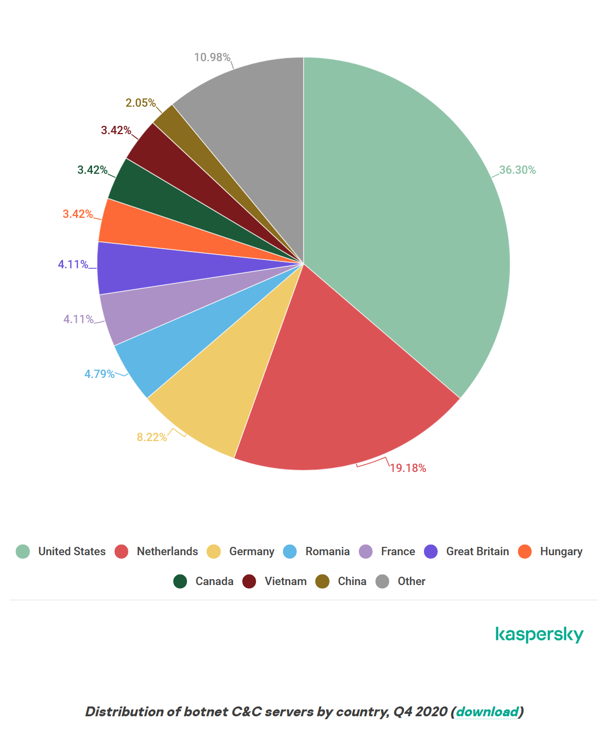 大部分僵尸网络C&C服务器位于美国(36.30%)、荷兰(19.18%)和德国(8.22%)。
