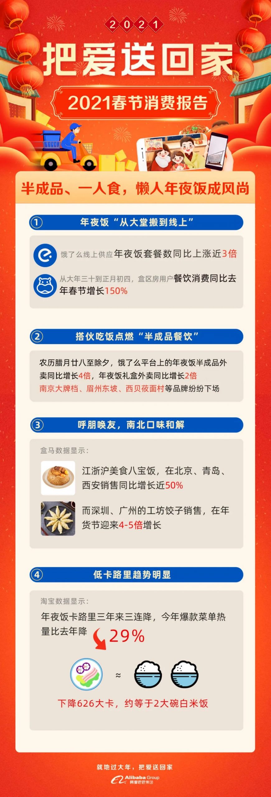 年夜饭消费生态也悄然改变。防疫带动年夜饭“从大堂到线上”;搭伙吃饭推动“南北口味和解”,“半成品”吸引力大大提升。农历腊月廿八至除夕,饿了么平台年夜饭半成品外卖同比增长4倍。与此同时,低卡路里菜单走俏。淘宝发现:年夜饭卡路里三年来三连降,今年爆款菜单热量比去年降29%。