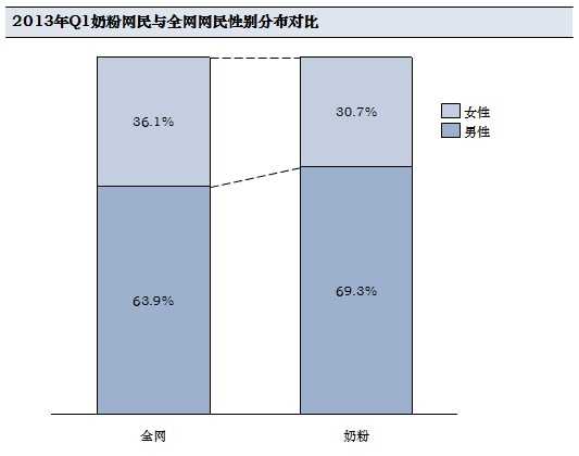 奶粉行业男性网民高于全网5个百分点奶粉网民中,男性网民高于女性网民,与全网相比,奶粉行业男性网民的占比高出5个百分点。