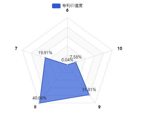 专利价值分布有效专利指专利申请被授权后,仍处于有效状态的专利。专利价值度评分是以incoPat系统中的专利“合享价值度”为依据。合享价值度主要依托于合享自主研发的专利价值模型进行计算,该专利价值模型融合了专利分析行业内最常见和重要的技术指标(如技术稳定性、技术先进性、保护范围层面等20多个技术指标),通过设定指标权重、计算顺序等参数,将专利分为1-10分,分数越高则专利价值越高,价值度为9-10分的专利为高价值专利。
