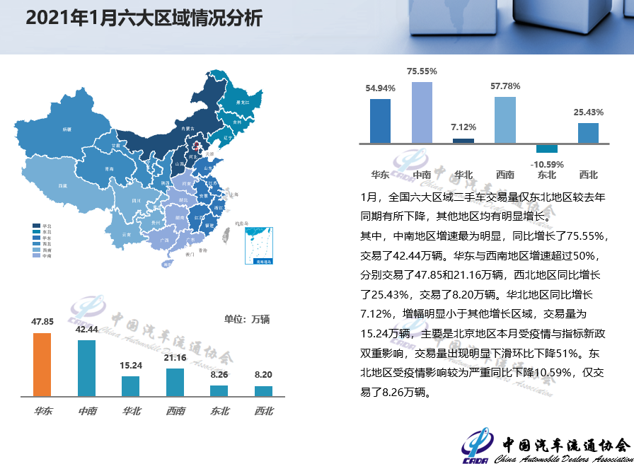 1月,全国六大区域二手车交易量仅东北地区较去年同期有所下降,其他地区均有明显增长。
