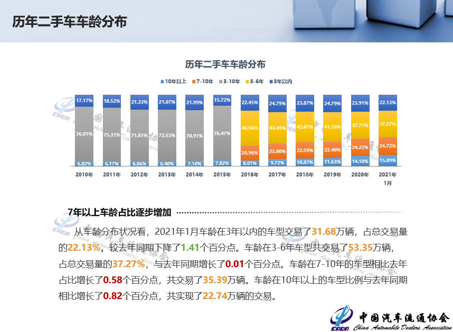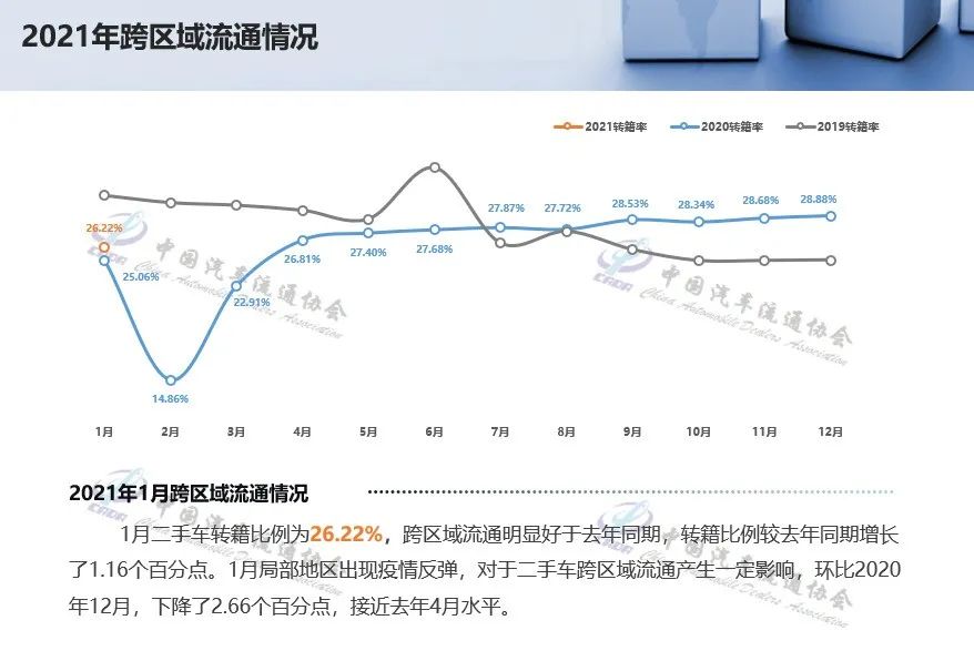 1月二手车转籍比例为26.22%,跨区域流通明显好于去年同期,转籍比例较去年同期增长了1.16个百分点。1月局部地区出现疫情反弹,对于二手车跨区域流通产生一定影响,环比2020年12月,下降了2.66个百分点,接近去年4月水平。