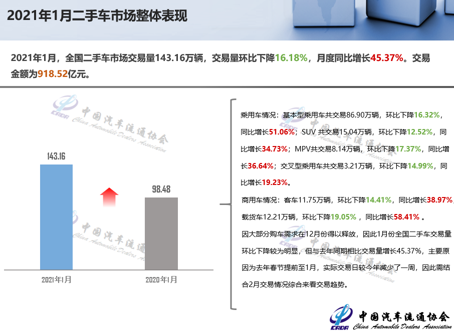 2021年1月,全国二手车市场交易量143.16万辆,交易量环比下降16.18%,月度同比增长45.37%。交易金额为918.52亿元。