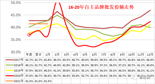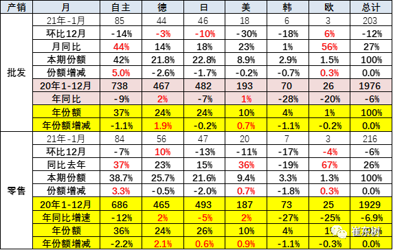 2021年1月份自主品牌份额41.5%,较前几年的份额仍改善较大,份额年末拉升,稍好于19年水平。自18年2021年1月以来,连续20个月的自主品牌份额都同比下降较大。19年的全年份额下降速度仍然较大。20年的疫情下的自主品牌份额2-3月回升。随后4-7月下降较大。9-2021年1月靠新能源回暖。