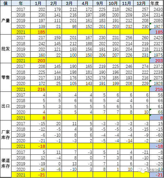 2021年1月的渠道库存相对减少19万辆.其中4-8月的经销商库存持续小幅补充,2021年1月去库存7.4万台力度较大,为1月开门红做准备。2019年渠道减少库存20万台,近两年渠道去库存幅度相近,形成连续两年持续去库存的特征。。