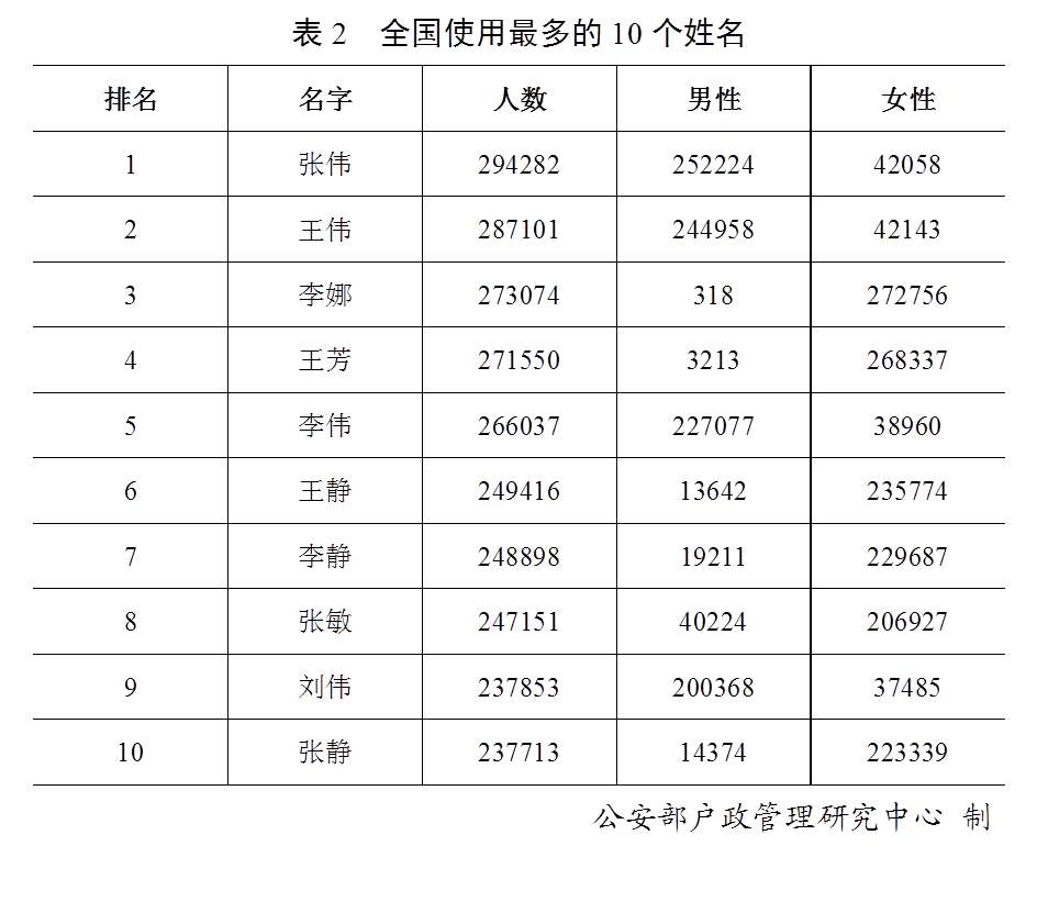 全国户籍人口中,使用频率最高的10个姓名依次为:“张伟”“王伟”“李娜”“王芳”“李伟”“王静”“李静”“张敏”“刘伟”“张静”。这些姓名男女皆有使用。