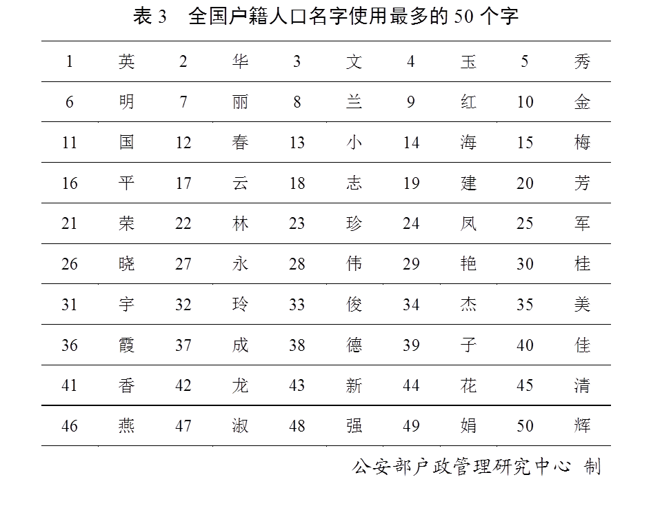 全国户籍人口中,名字使用频率最高的50个字依为“英”“华”“文”“玉”“秀”“明”“丽”“兰”“红”“金”等。