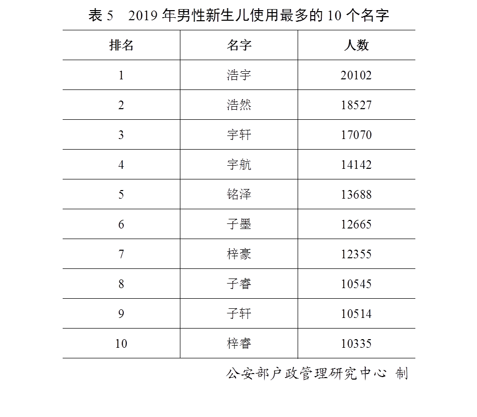 2019年出生并已经进行户籍登记的男性新生儿中,使用频率最高的10个名字依次为:“浩宇”“浩然”“宇轩”“宇航”“铭泽”“子墨”“梓豪”“子睿”“子轩”“梓睿”。与2018年相比,“铭泽”“子墨”“子睿”“梓睿”进入前十。