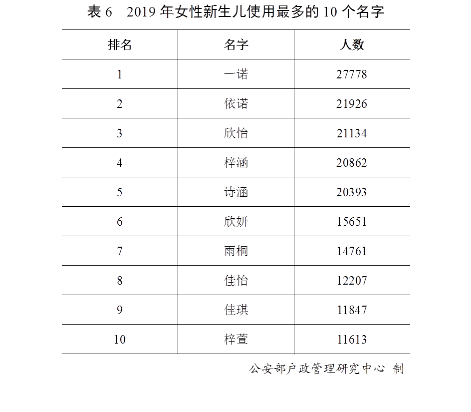 2019年出生并已经进行户籍登记的女性新生儿中,使用频率最高的10个名字依次为:“一诺”“依诺”“欣怡”“梓涵”“诗涵”“欣妍”“雨桐”“佳怡”“佳琪”“梓萱”。与2018年相比,“佳琪”进入前十。