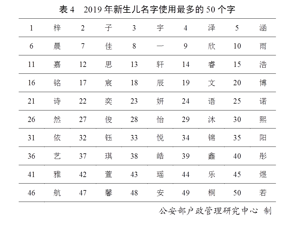 2019年出生并已经进行户籍登记的新生儿名字中,使用频率最高的50个字依次为“梓”“子”“宇”“泽”“涵”“晨”“佳” “一”“欣”“雨”等。与2018年相比,“锦”“瑶”“煜”“安”等字新晋成为新生儿起名用字首选。