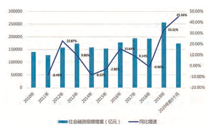 2020年伊始,中国经济社会发展遭受了新冠肺炎疫情的严峻冲击,但前5个月社会融资规模增量达到174034亿元,较2019年同期上涨了45.16%。