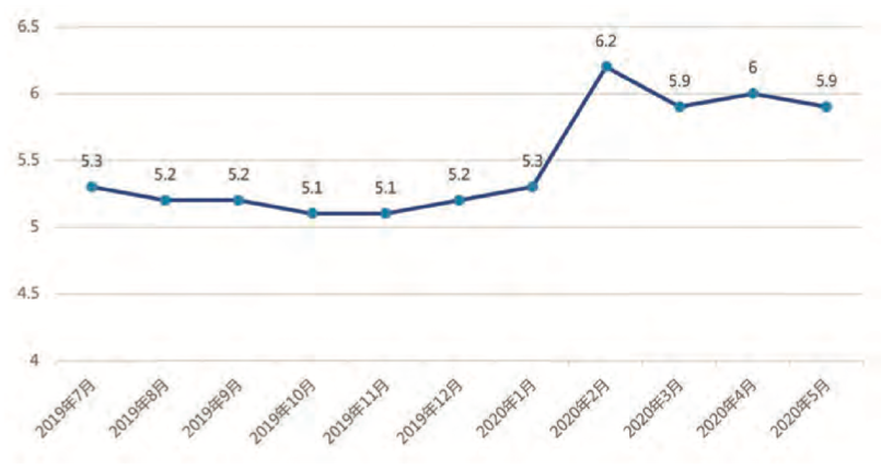 图2-1:全国城镇调查失业率(2019/7—2020/5)