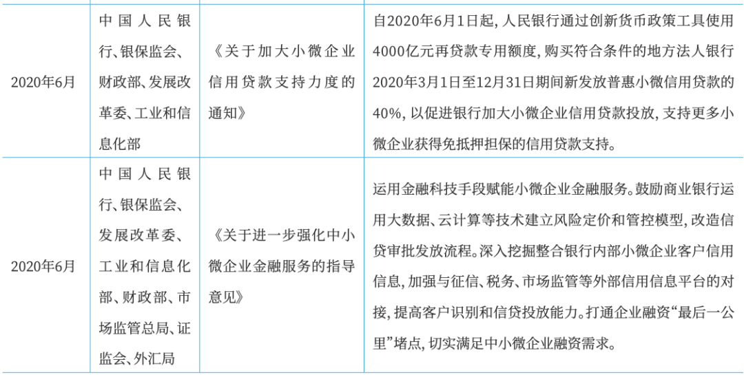 中国人民银行、财政部、发改委、银保监会、税务总局、工信部等部委持续推进。一方面,通过定向降准、加大财税支持力度、优化营商环境和深入推进“放管服”改革等举措,推动小微企业健康有序发展;另一方面,实施“两增两控”目标,加快社会信用体系建设,对金融机构实施小微贷款考核激励机制,鼓励金融机构加强小微金融创新,引导更多社会资本流向小微。