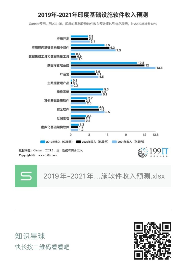 2019年-2021年印度基础设施软件收入预测(附原数据表) 更多阅读:2020年第四季度印度PC电脑厂商出货量及增长率(附原数据表) 2020年Q4印度可穿戴设备出货量及增长率(附原数据表)2020年印度智能手机出货量市场份额(附原数据表) 2020年第四季度印度智能手机出货量及增长率(附原数据表) 2020年第四季度印度智能手机出货量市场份额(附原数据表) 2020年第二季度印度智能手机TOP5厂商出货量及增长率(附原数据表) 2020年Q2印度智能手机主要厂商出货量及增长率(附原数据表) Canalys:2019年第四季度印度智能手机市场总出货量为3900万台Counterpoint:2019年Q2印度智能手机出货量达到3700万部Think with Google:印度搜索洞察报告APUS:2018印度互联网金融报告eMarketer:预计2017年印度成人数字媒体日使用时长为 78 分钟移动经济: 2015印度2020年印度智能手机出货量及增长率(附原数据表) 印度互联网与社会中心:印度AI制造业发展状况报告