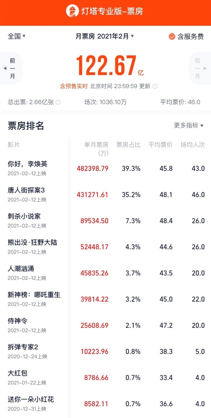 2月累计观影人次达2.66亿,与18年同期持平。月票房前三分别是票房已达48.23亿元的《你好,李焕英》、票房达43.12亿元的《唐人街探案3》和票房超8.95亿元的《刺杀小说家》。
