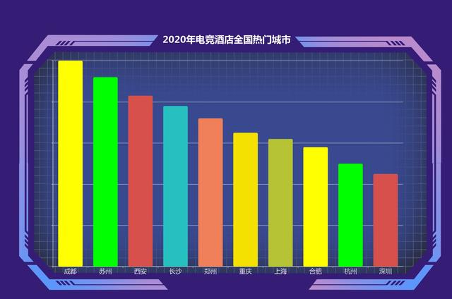 新一线城市是电竞酒店发展的主力军,也是最为热门的城市。《报告》的数据显示,成都人更加热衷电竞酒店,北京与西部地区则相对热度较低。2020年电竞酒店全国十大热门城市分别是:成都、苏州、西安、长沙、郑州、重庆、上海、合肥、杭州和深圳。