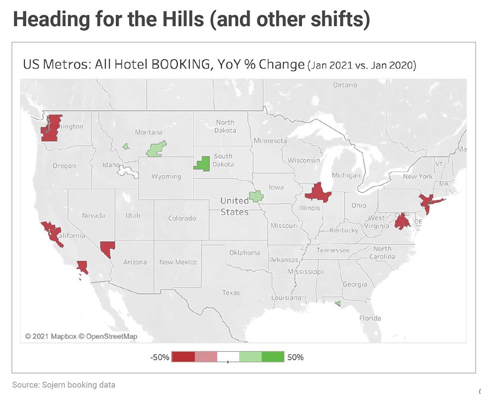 在美国,正如预期的那样,随着大流行在2020年初开始,以及全国范围内实施的社交疏远措施,前往芝加哥、西雅图和纽约等大城市的旅游人数大幅下降,而奥马哈、内布拉斯加和蒙大拿州比林斯等偏远和农村地区的旅游人数同比增长。