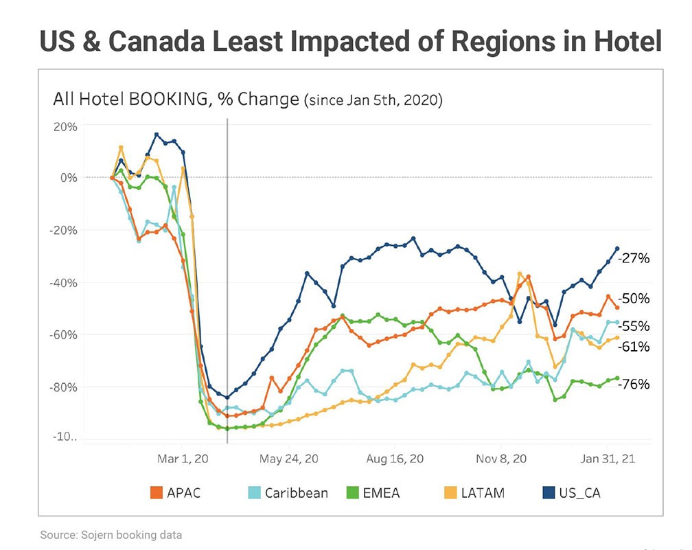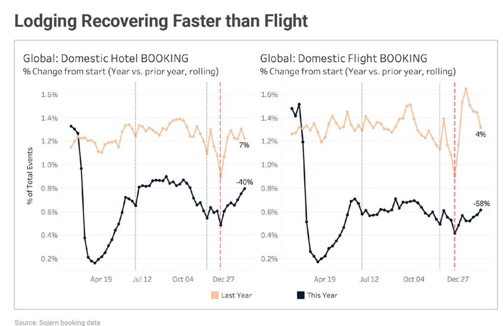 由于旅行者选择离家较近的目的地,他们更有可能开车而不是坐飞机。从国内酒店预订量与国内航班预订量以及它们的恢复情况来看,酒店的预订量已经恢复了40%,相比一年前,航班下降了60%。