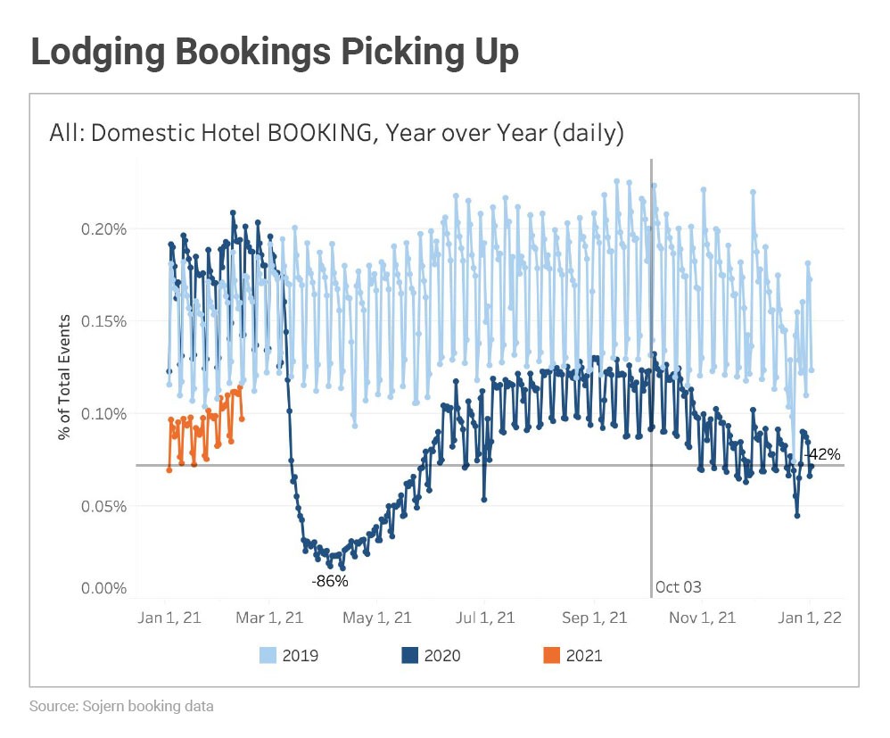 将住宿预订细分为每日视图时,我们会看到一些令人兴奋的增长。我们可以看到持续复苏的早期迹象——2021年旅游预订数据呈上升趋势。