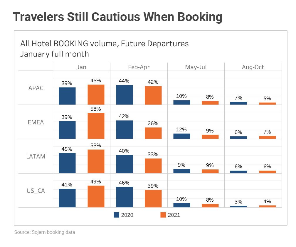 预订窗口仍然很短。2021年,每个地区在1月份搜索当月份旅游的人数都比去年有所增长。